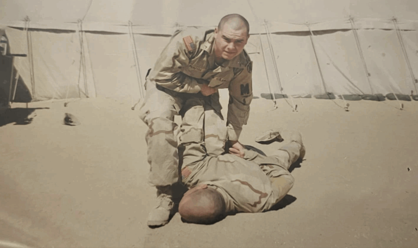 Photo courtesy of Rico Pereyda, performing restraint holds while doing combatives training in Kuwait prior to getting into Iraq.