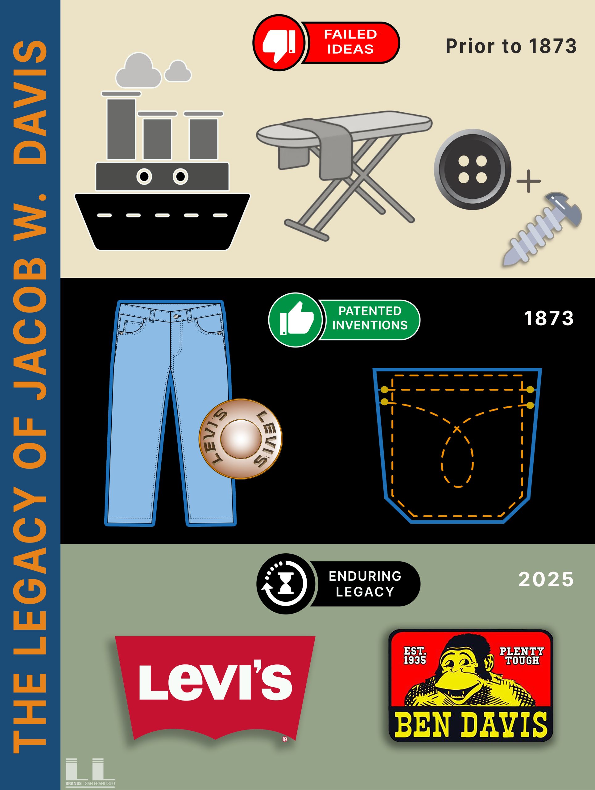 Jacob W. Davis, or J.W. as he liked to be called, was a tailor from Riga, Latvia, who immigrated to the United States in 1854 at the age of twenty-three. He traveled across the U.S. and Canada looking for work, filing patents along the way for a canal steamboat, an ironing board, and a button that fastened with a screw, but nothing took.