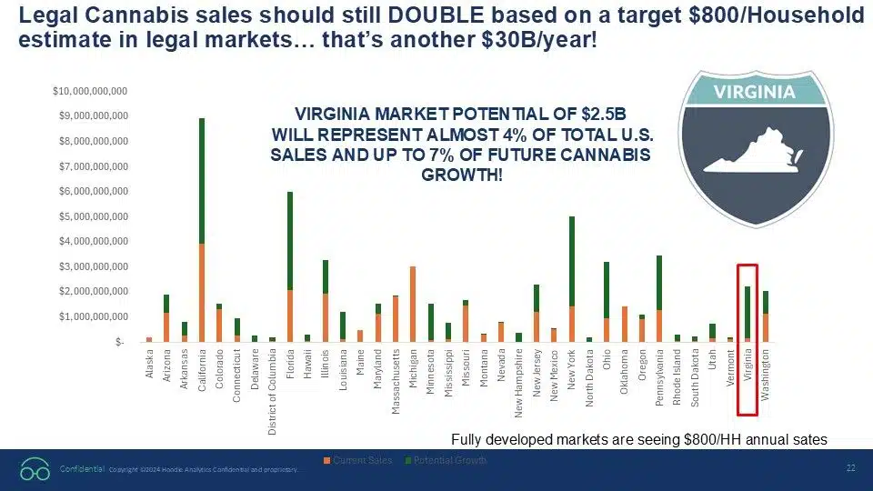 This week, Hoodie Analytics co-founder and president Kris Walker shared a chart that lit up LinkedIn and the industry. His message was simple but bold: “A fully developed recreational adult-use program in Virginia represents almost 4% of total U.S. cannabis sales and nearly 7% of future growth.”