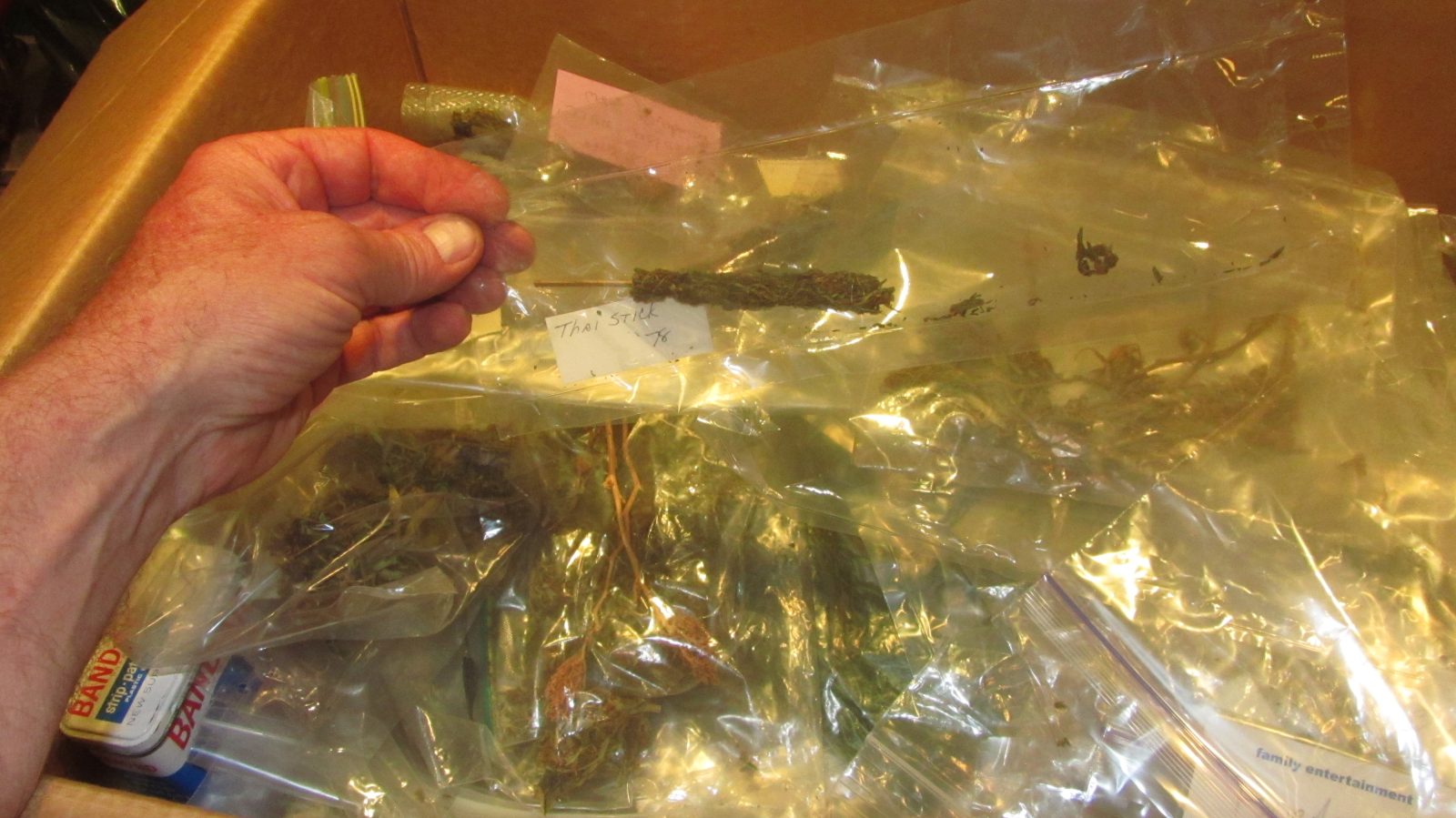The photo shoot itself felt like a celebration. Cannabis journalist Jackie Bryant, known in cannabis circles as The Plant Lady, arrived with her photographer, both visibly excited. Mark began laying out his collection piece by piece. Some buds were bright and fluffy, others brittle and shrunk by time. The baggies themselves were unmarked.