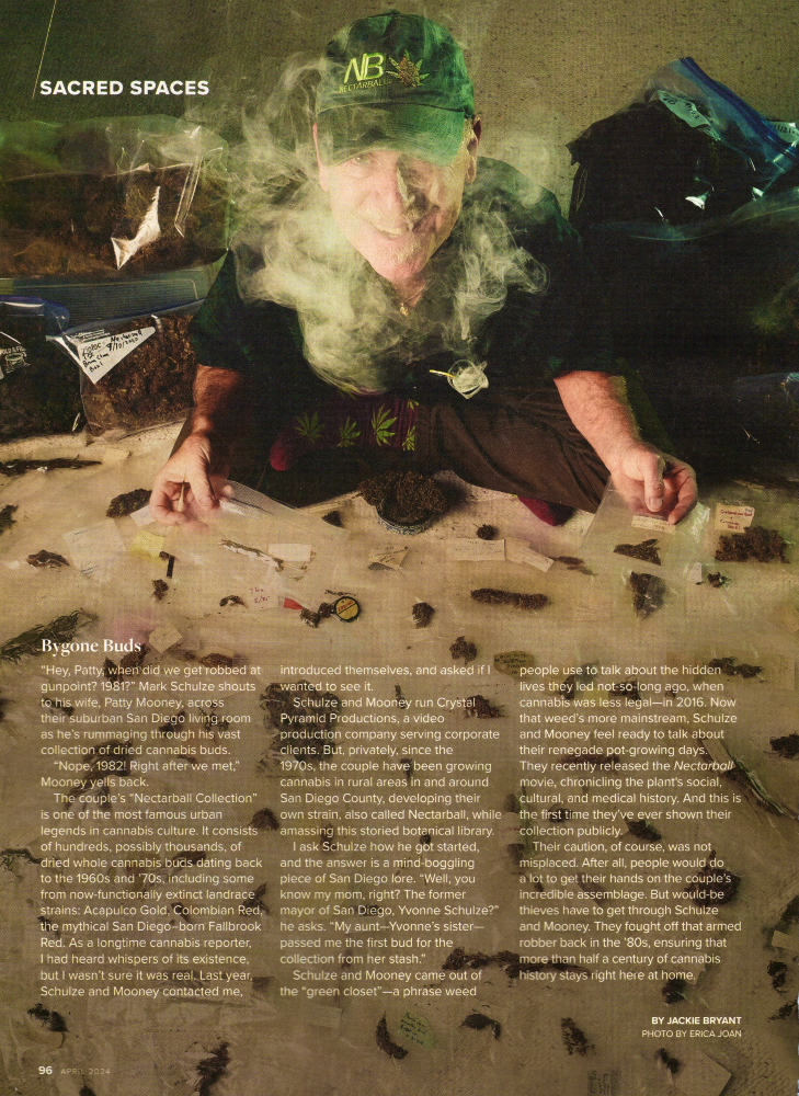 The photo was unforgettable: Mark Schulze seated cross-legged on our living room floor, surrounded by hundreds of “classic” cannabis buds mostly from the 1970s and 80s, sealed in plastic baggies. When San Diego Magazine devoted the final page of its April 2024 issue to the image for its Sacred Spaces feature, it offered readers a rare glimpse into The Nectarball Collection—a decades-long archive of cannabis history perfectly preserved.