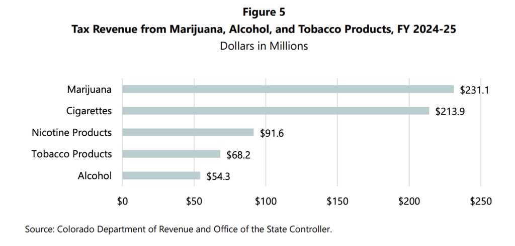 Following that, however, “revenue fell for the first time in FY 2021-22, and has declined each year since,” the Legislative Council said. “Marijuana tax revenue fell to $231.1 million in FY 2024-25, 45.5 percent below its FY 2020-21 peak.”