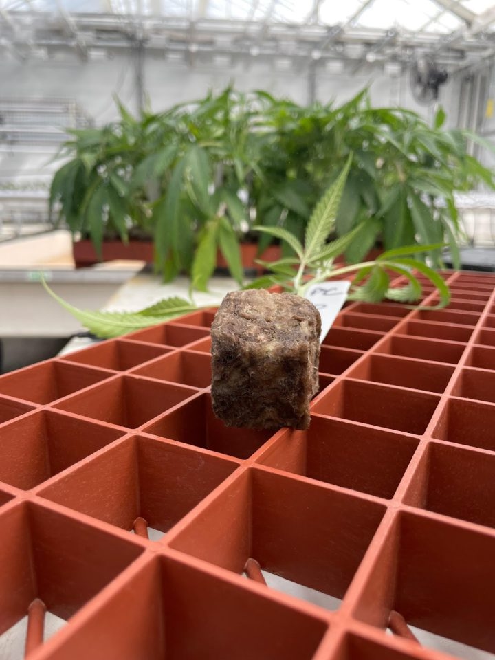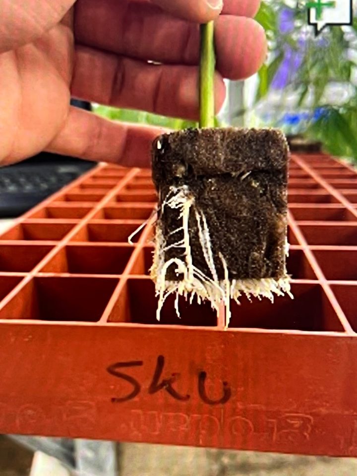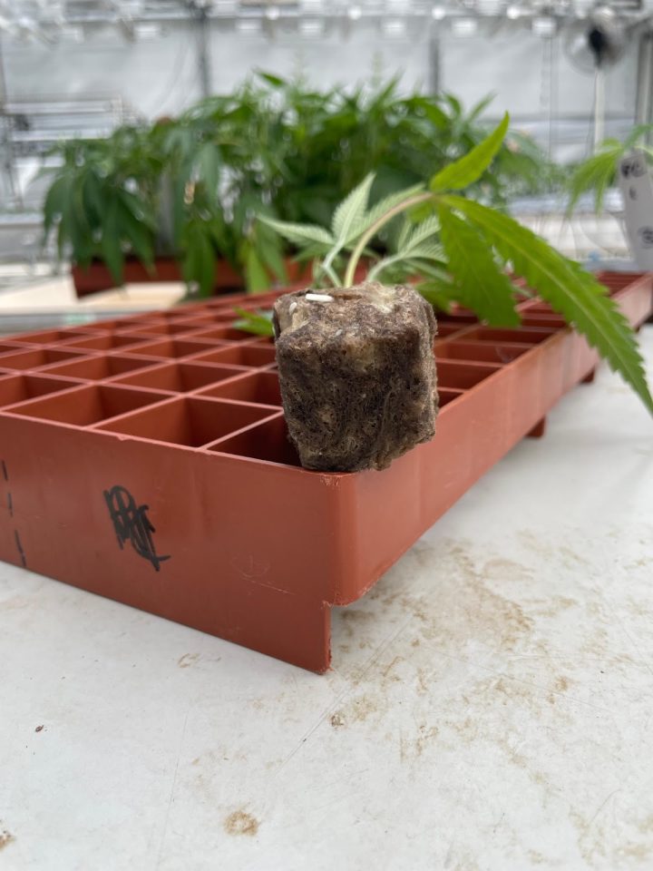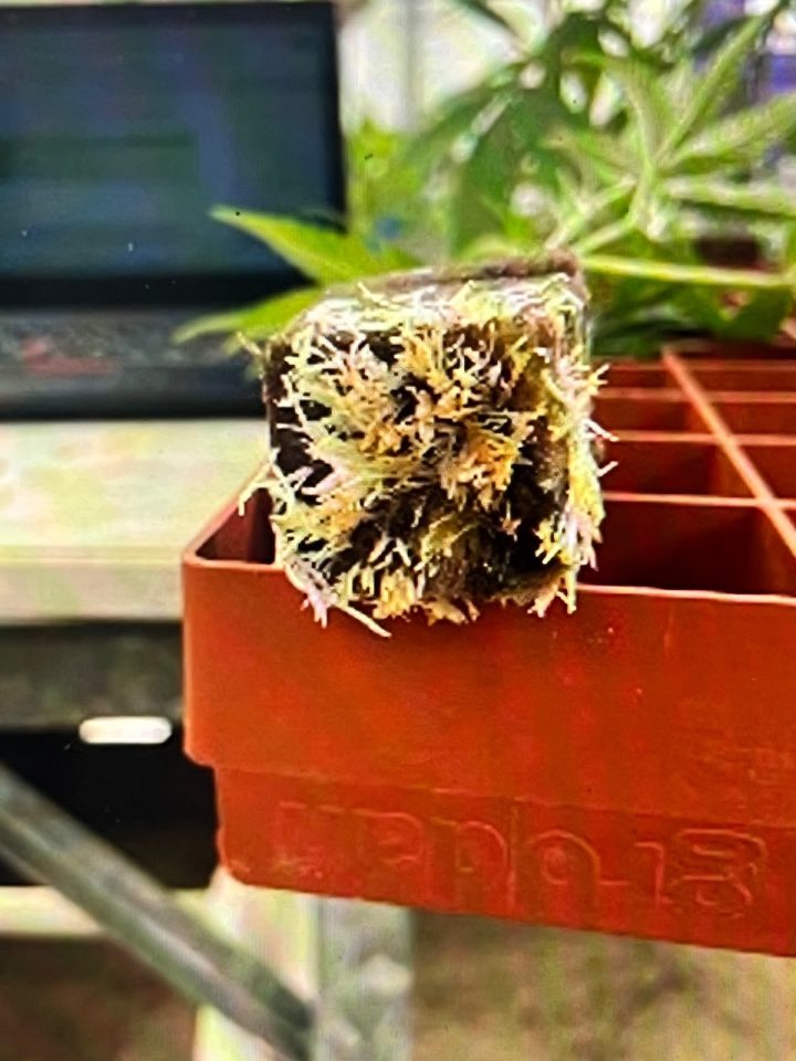 Example root score 0 – No roots visible at the bottom or lateral sides of the rockwool plug (Hoofwijk, August 2025). Do not plant.
