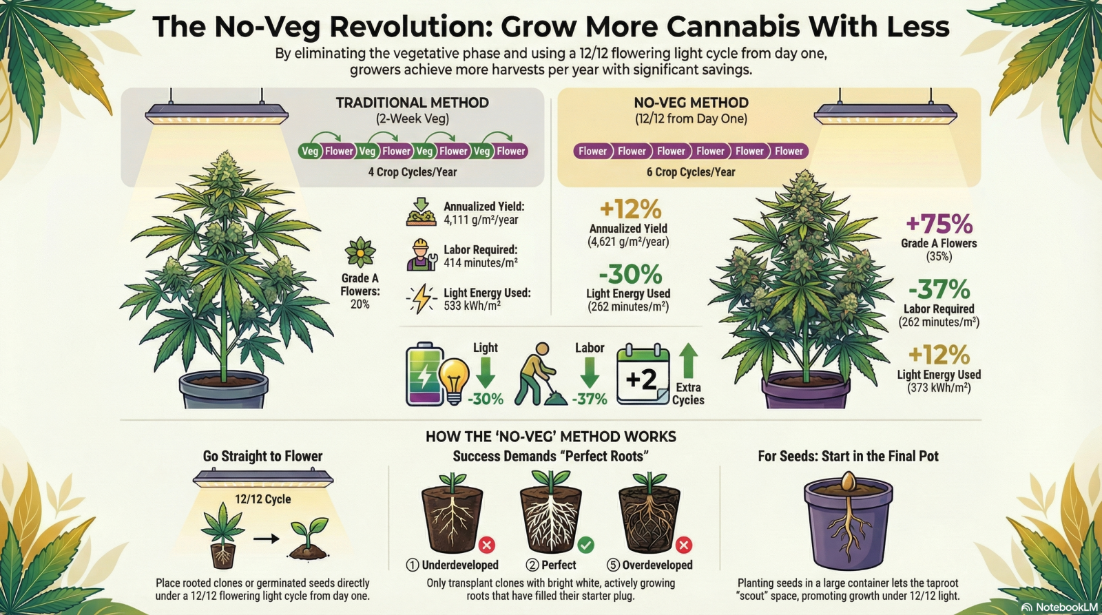 A “No-Veg” method flips plants straight to 12/12, trading smaller individual yields for higher annual output and a dramatic jump in top-shelf buds.
