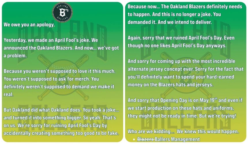 A half-baked idea, repurposed as a last-minute April Fools’ Day joke, to temporarily turn the Oakland Ballers into the herb-green, pot-leaf-emblazoned Oakland Blazers has been such a big hit with fans that the baseball team has decided to officially adopt the alternate identity in the upcoming season.