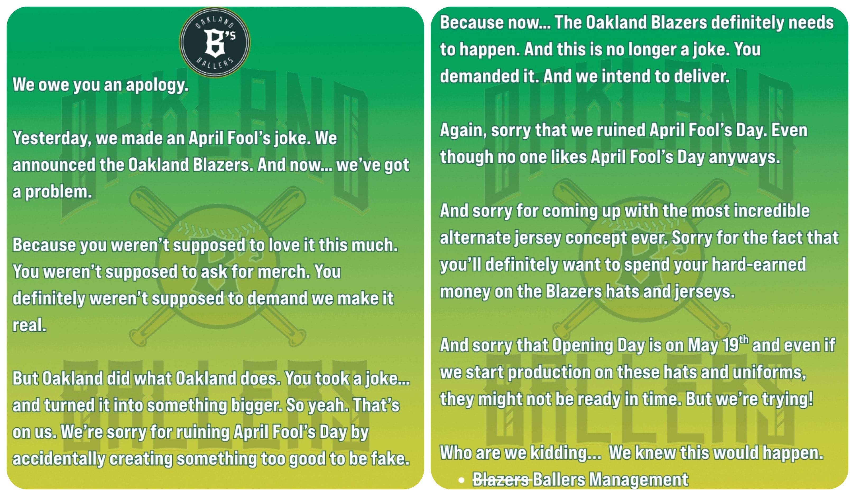 “Maybe it’s the first April Fools’ Day joke that we now have to do in real life,” Ballers co-founder and CEO Paul Freedman told me in a phone interview on April 2, less than 30 hours after the following message was posted to the team’s official Instagram account shortly past noon on April 1: