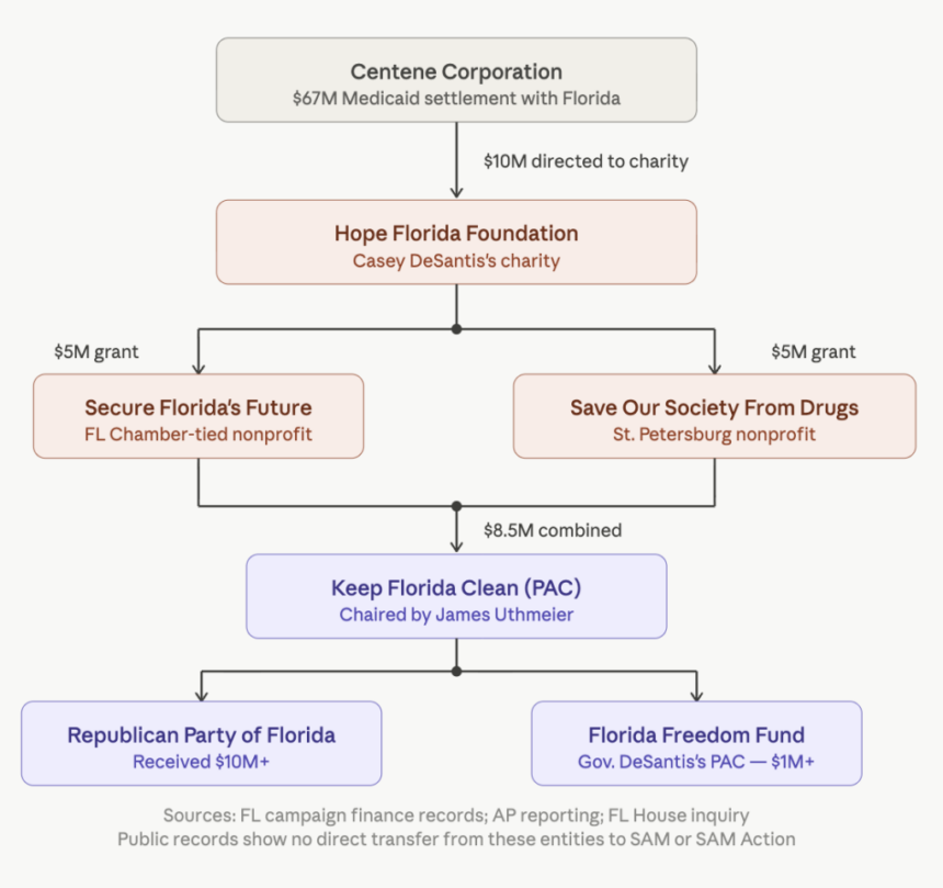 A $10 million payment tied to a Florida Medicaid settlement moved through the Hope Florida Foundation, into two anti-drug nonprofits, and then into a political committee fighting marijuana legalization. Public filings also show a major funding surge at SAM Action during the same period. The full picture remains incomplete, but the overlap, timing, and money trail raise serious questions.
