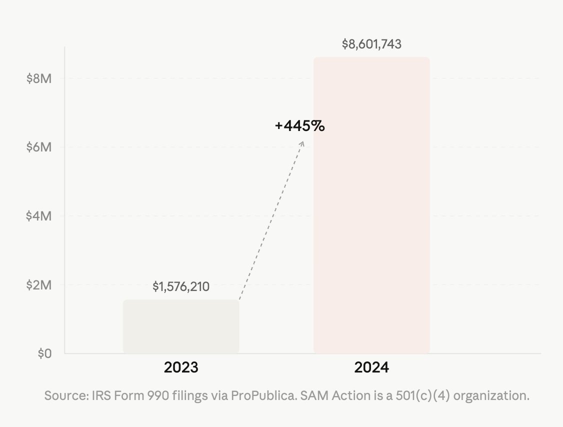 SAM Action, the organization’s 501(c)(4) entity, reported $8,601,743 in contributions for 2024, according to its Form 990 filed with the IRS. That represents a 445% increase from the $1,576,210 the organization reported receiving in 2023.