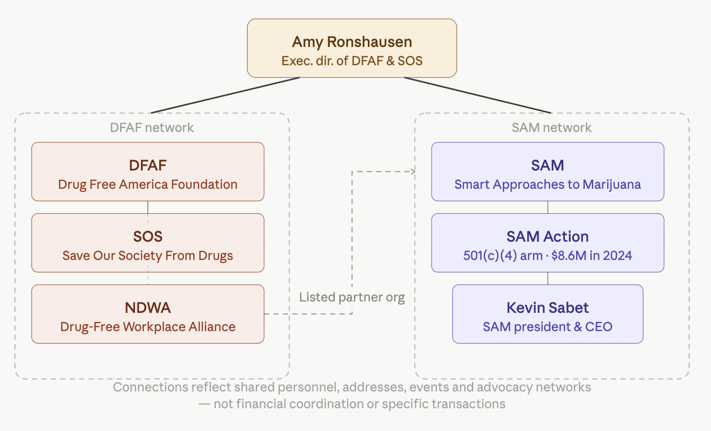 That executive director, Amy Ronshausen, has longstanding ties to Smart Approaches to Marijuana. Ronshausen has appeared at SAM events and, in February 2025, spoke at SAM’s Good Drug Policy Summit in Washington alongside SAM president Kevin Sabet and members of Congress, according to SAM’s own materials.