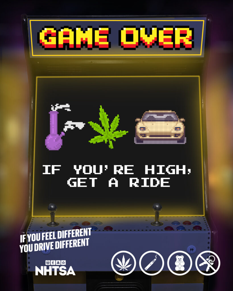 One ad depicts a video game arcade cabinet that says “Game Over” and “If You’re High, Get A Ride.” The screen shows a bong with smoke coming out, a cannabis leaf and a car.